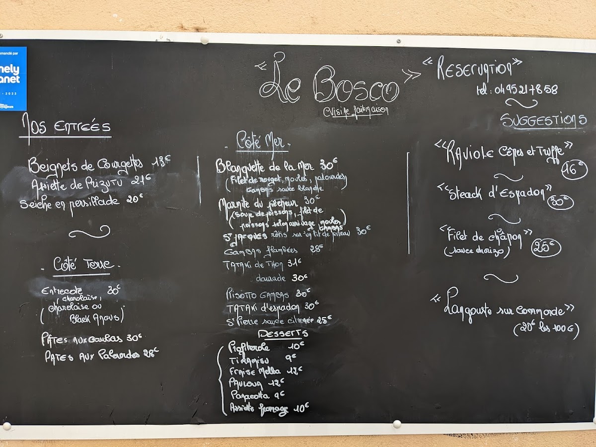 Le Bosco, located at 10 Rue Conventionnel Chiappe, 20000 Ajaccio, France, offers a well-rounded and enticing menu that highlights the freshness of Mediterranean ingredients, blending traditional flavors with contemporary touches. The Beignets de courgettes offers a crisp, flavorful start to any meal, perfectly balancing the softness of zucchini with the light crunch of the batter. Moving on to main courses, the Filet de St Pierre or the Filet de Daurade Royale (depending on availability) stand out for their delicate textures and fresh flavors, showcasing the best of local seafood. The fish is expertly prepared, offering a clean, subtle taste that pairs wonderfully with the sides.